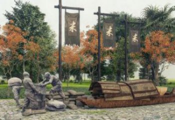 市井生活:傳統商貿與家庭溫情銅雕圖景 采用銅雕這一經典材質,利用銅的質感與耐久性,塑造出富有歷史厚重感的景觀雕塑。銅雕的古樸色澤,能自然融入戶外環境,經歲月沉淀更具韻味,成為公園等場所中持久的文化符號,以雕塑小品的形式,為景觀增添人文深度。精準復刻傳統市井商貿場景,從人物服飾(長袍、傳統發髻 )到交易道具(布匹、長桌 ),細致展現舊時風貌。商人的長辮、婦人的寬袖衣衫,還原特定歷史時期的著裝特征,讓觀者直觀感受往昔生活片段,喚醒對傳統商貿文化的記憶,成為民俗文化傳播的生動載體。作為景觀雕塑,與周邊自然環境(草地、樹木 )呼應。人物、道具的布局,既形成獨立觀賞焦點,又與綠意背景和諧共存,成為公園景觀中文化與自然融合的節點,供游客駐足、觀賞、聯想,提升公共空間的文化體驗與藝術氛圍,使雕塑小品成為激活景觀活力、講述文化故事的媒介。