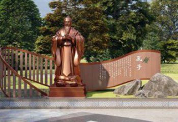 此為鍛銅材質的孔子人物景觀雕塑,立于戶外公共空間。雕像呈拱手行禮姿態,長髯垂胸,紋飾古樸莊重,整體氣勢沉穩肅穆。既還原了孔子 “溫而厲,威而不猛” 的儒者風貌,也承載著尊師重道、傳承文脈的文化意涵,是兼具藝術審美與教化功能的公共景觀作品。